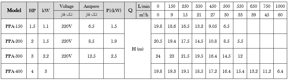 جدول عملکردی پمپ استخری سری PPA